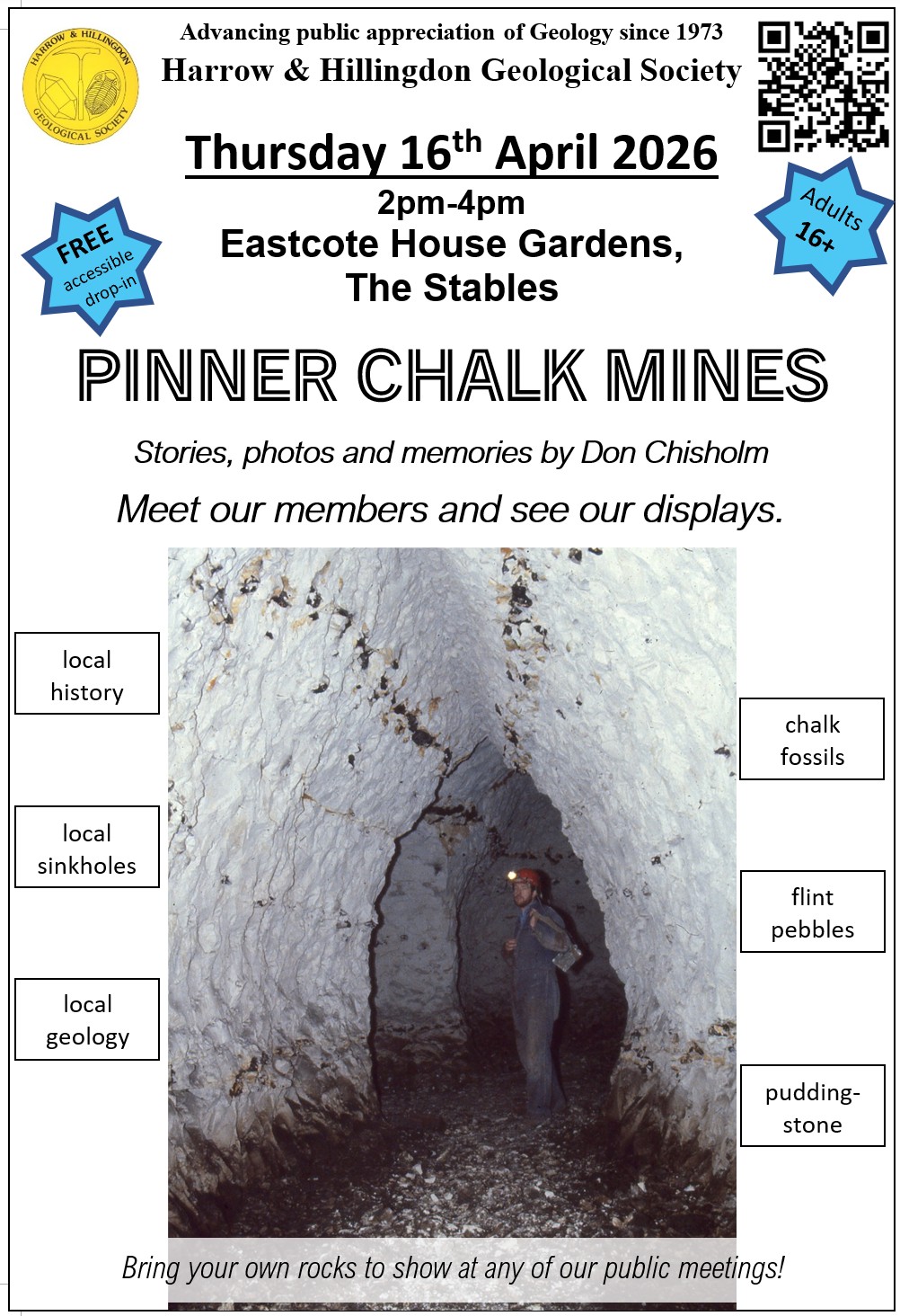 Come and find out about Pinner Chalk Mines. Special guest, Don Chisholm, will be telling us what he has uncovered about this unique aspect of local history. He has photos going back to the 1980s, when the historic tunnels were re-opened and studied. Meet members of Harrow & Hillingdon Geological Society, see their chalk displays including local fossils; you will be able to handle rocks such as puddingstone, which played an important part in keeping Pinner’s miners safe.Ruislip, Northwood and Eastcote Local History Society